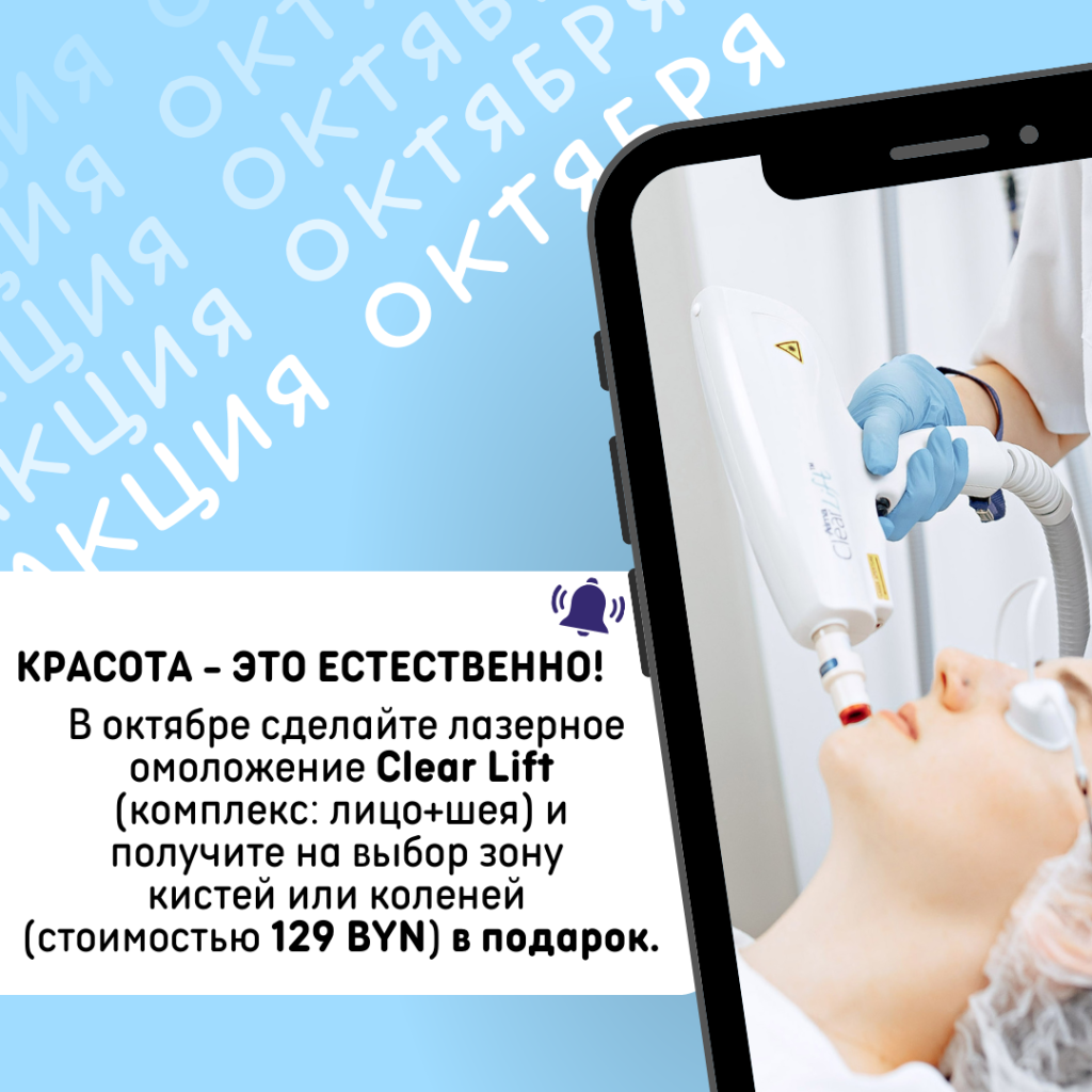 В октябре сделайте лазерное омоложение Clear Lift (комплекс: лицо+шея) и получите на выбор зону кистей или коленей (стоимостью 129 BYN) в подарок.
