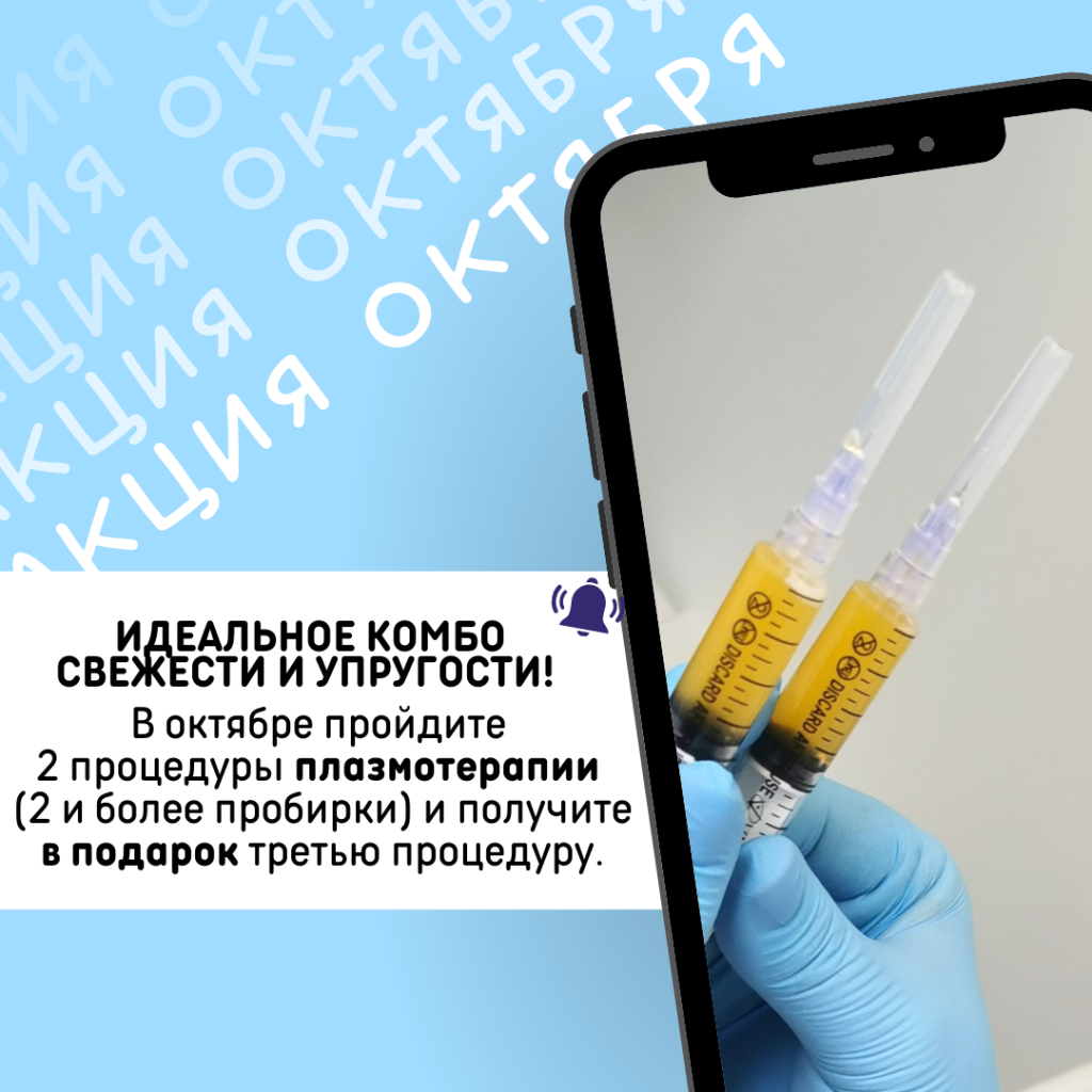 В октябре пройдите 2 процедуры плазмотерапии (2 и более пробирки) и получите в подарок третью процедуру!